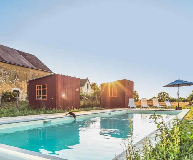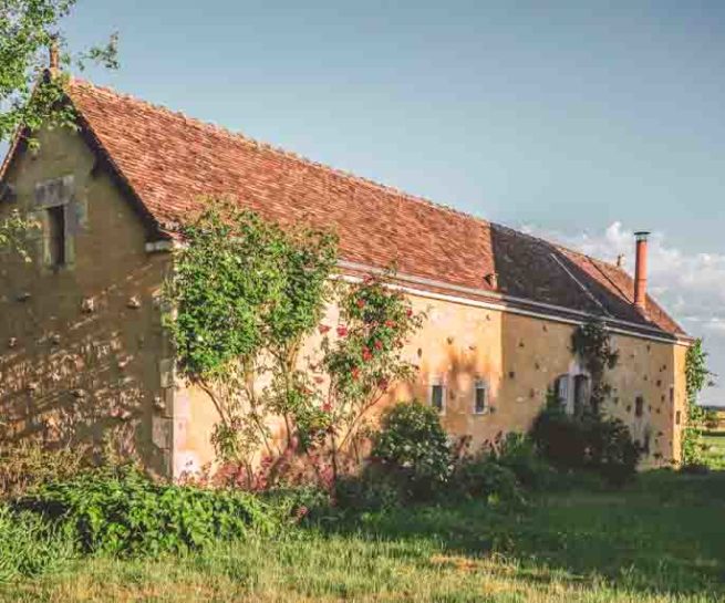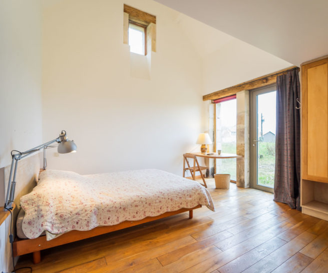 2 accès extérieurs sont possibles, côté Est avec une table pour les repas à l’air libre et un accès côté ouest donnant sur la cour de la ferme.
