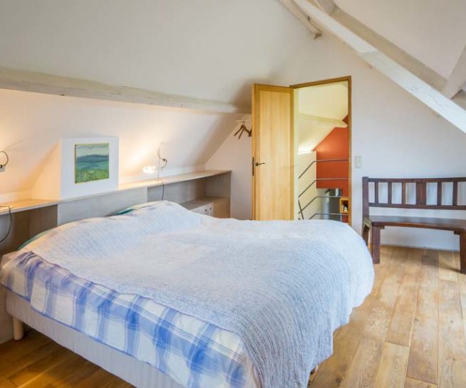 - 1 chambre à l’étage avec un lit double et un accès sur un balcon.