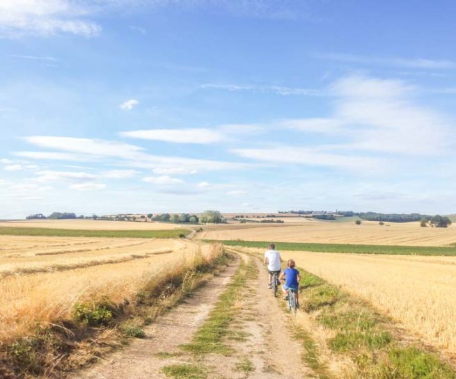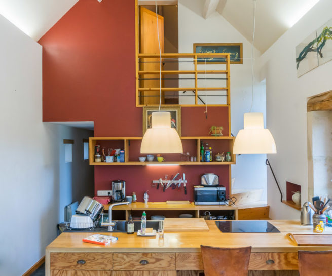 La cuisine est aménagée et ouverte sur le salon, ce qui permet de cuisiner tout en profitant de la vue par la baie vitrée ouverte sur la campagne et du reste de la famille en attente que le repas soit prêt.